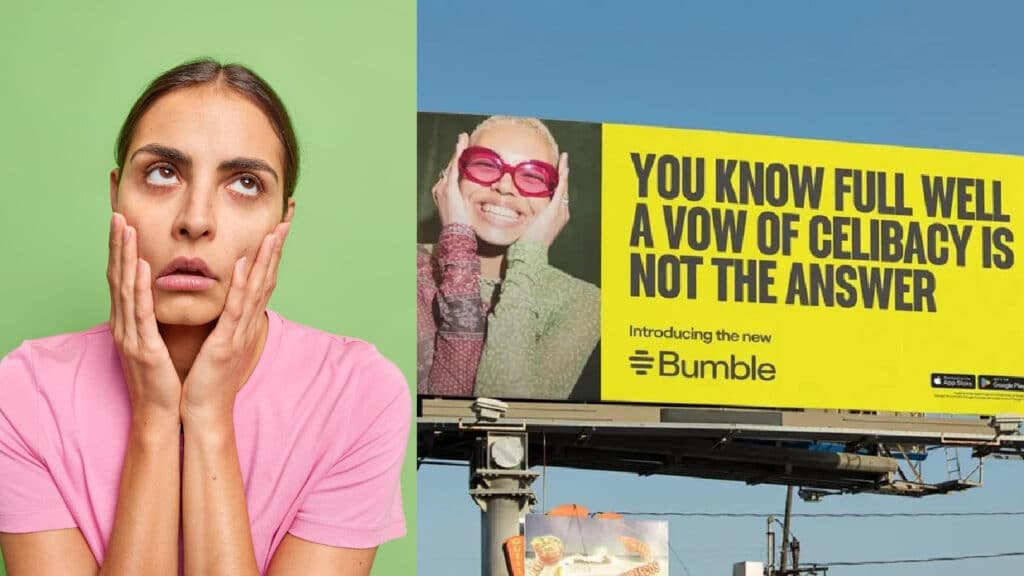 However, seeing the app’s billboards with slogans like “You know full well a vow of celibacy is not the answer” makes us think, “Who asked you?” The platform’s campaign includes tasteless jokes like a woman transforming into a nun to “swear off dating.”