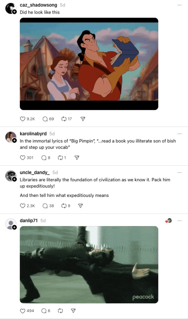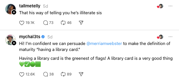 Yes, you read that right. In a post that went viral on Threads, Jada Celeste simply wanted to vent about her latest heartbreak. Celeste recounted how she had been dating a guy for two weeks until he noticed she had a library card in her wallet. “[He] told me that he needed to find a woman more ‘mature’ and that only kids visit libraries nowadays.”