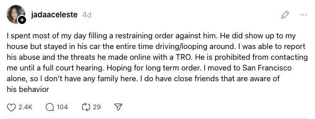 After learning that Celeste had shared the story on Threads, the guy accused her of lying and began harassing her at her home. “I spent most of my day filing a restraining order against him,” she said. “He did show up at my house but stayed in his car the entire time driving/looping around.”