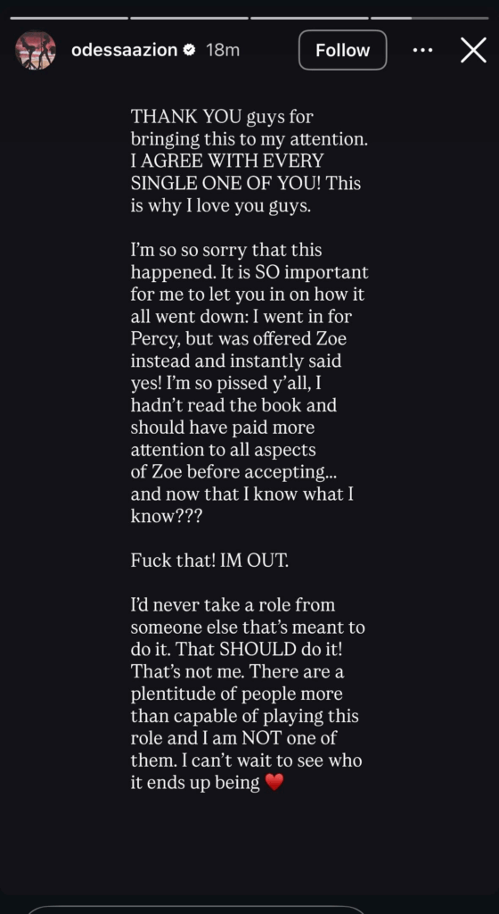 “I’m so sorry that this happened. I went in for Percy, but was offered Zoe instead and instantly said yes! I’m so pissed y’all, I hadn’t read the book and should have paid attention to all aspects of Zoe before accepting… and now that I know what I know? F**k that. I’m out!”