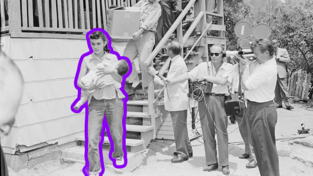 Aurora Vargas is carried by Los Angeles County Sheriff’s deputies on May 8, 1959, after her family refused to leave their home. Credit: Hugh Amott, Los Angeles Times.