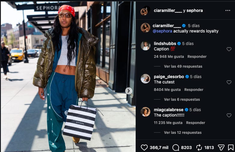 What did Ciara do? She showed up on a red carpet a few days later and said, with a smile, that she was “thriving.” Then she posted a photo of herself in a blue tracksuit outside Sephora, with the caption: “@sephora actually rewards loyalty.”
